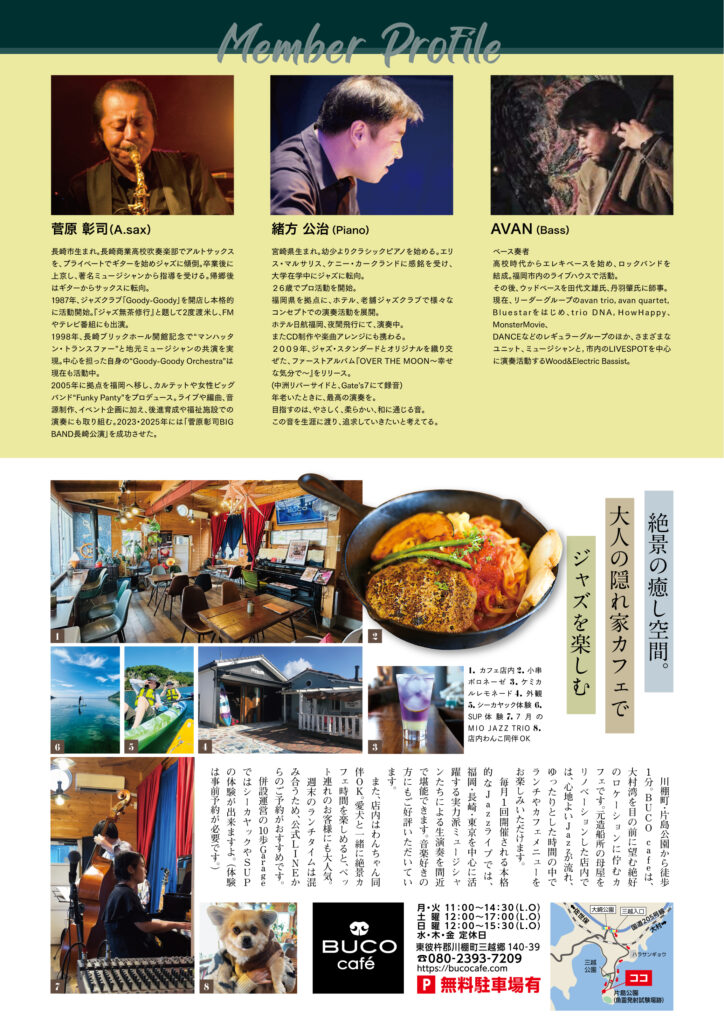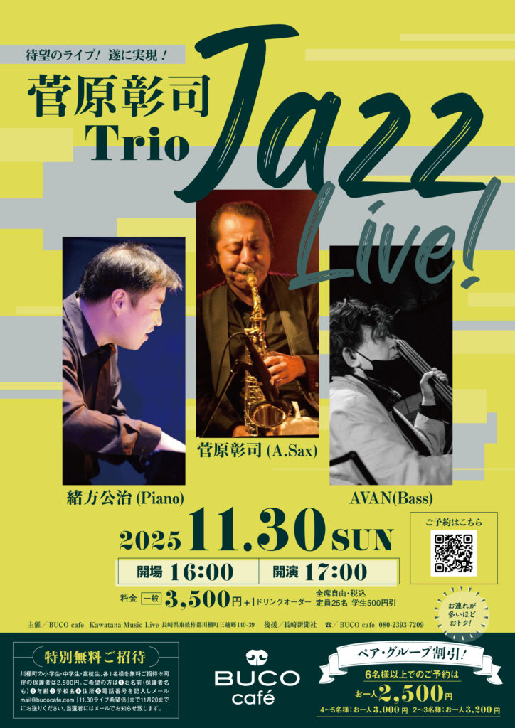 Alto SAXの名手 菅原彰司さんと福岡から凄腕のお二人、緒方公治(Piano)、AVAN(Bass)さんを迎えたJazz Liveです!